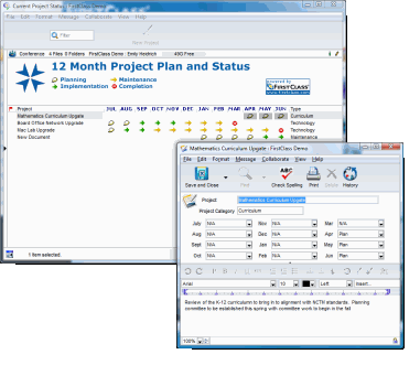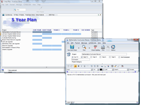 The 5 Year Plan and 12 Month Project Status plan solutions are a series of custom forms, application rules and custom columns that can provide a visual representation of project plans and status. |