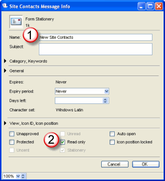 If you only want certain people to be able to use the New Contacts stationery, you can HIDE it from others by Right-Clicking the toolbar stationery and choosing Properties to bring up the properties window again. Now, set it as unapproved