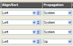 Align/Sort and Propagation Choose Left or Right or Center for how you want your data to be displayed. The other options are beyond the scope of this document. For Propagation, the best rule of thumb is to choose System if you chose one of the default field types in column 2, and Up if you choose any other field value.